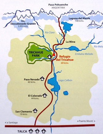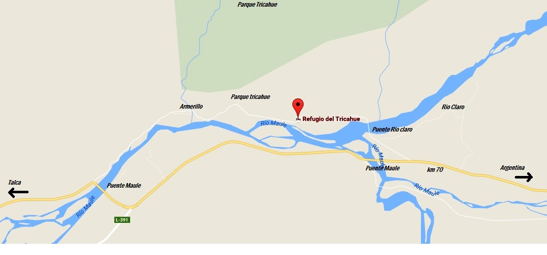 Desde Talca. 69 km. Tomar la carretera "San Clemente-Paso Pehuenche". Dejar atrás las comunas de San Clemente, El Colorado, Paso Nevado, y tomar el camino de ripio para Armerillo antes de cruzar el puente Maule 1. Cruzar el pueblo Armerillo, Dirección "Puente los vientos". El "Refugio del Tricahue" se ubica más o menos dos kilómetros después de las ultimas casas del pueblo. Está indicado con un letrero a mano izquierda. Si ustedes vienen de Argentina, hay más o menos 100 km desde el Paso Pehuenche, seguir hacia Armerillo. El Refugio se ubica a más o menos 500 metros después del "Puente los vientos" dominando el Río Claro.